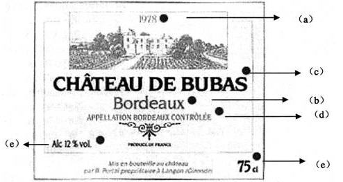 (2)从(b)处所指的"Bordeaux"的文字,说明该酒产于何国、何区?